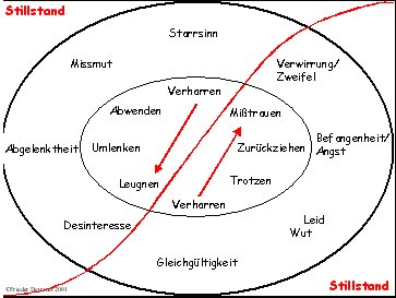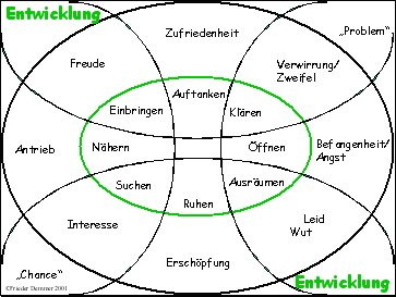 Die "Themenkreise" (zwei Beispiele sind abgebildet) helfen dabei, bestimmte Gefühlszustände den unterschiedlichen Lösungsphasen gegebener Problemstellungen oder auch Entwicklungshasen in Beziehungen zuzuordnen und daraus Handlungsoptionen abzuleiten.