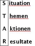 Die S-T-A-R-Struktur ist sehr hilfreich, wenn es darum geht, Lösungen für eine gegebene Situation zu entwickeln, indem man einen thematischen "Trichter" aufbaut: Von eher allgemeinen Befindlichkeiten "kreist" man den Kern der Sache immer weiter ein - bis zur verbindlichen Vereinbarung konkreter Handlungsschritte.