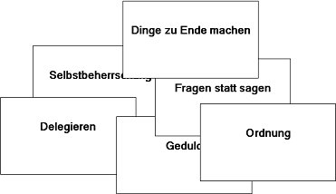 Der entscheidende Punkt ist dabei weniger die Karte im Geldbeutel, als der Auswahlprozess: DAS ist gerade MEIN Thema!Im Sinne einer höheren emotionalen Ladung und gleichzeitig eines geringeren "Offenbarungsrisikos" Dritten gegenüber ist auch eine symbolische Umsetzung des Begriffes auf der Karte möglich. Im Verlauf eines Coaching-Prozesses kann so ein ganz individueller Satz aus wechselnden Karten entstehen.